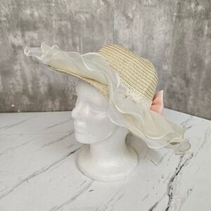 vintage straw hat, wide brim straw hat, ruffle brim hat, organza trim hat, kentucky derby hat, tea party hat, easter bonnet, garden party hat, wedding guest hat, bridal shower hat, southern belle hat, retro sun hat, vintage summer hat, 1980s vintage hat, romantic cottagecore hat