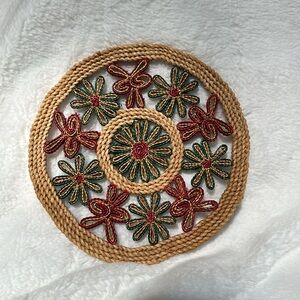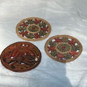 Vintage Straw Potholders Trivet Tan, Green, Cream & Fuchsia mixed colored. Two are braided and almost identical other is thicker and has some wear around the edges as shown. Beautiful vintage pieces. I love to bundle!