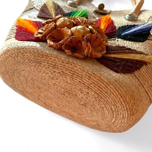 Circular straw pattern with multi color threaded feather and raffia nuts design on front side. Tan leather handles with metal turn clasp for closure. Clean both inside and out. Some wear to the handles as shown.