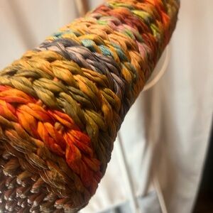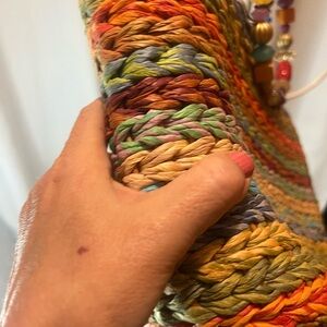 Brighten your style with this vibrant woven handbag. Featuring a multicolor design and a unique beaded handle, this bag is perfect for any occasion.