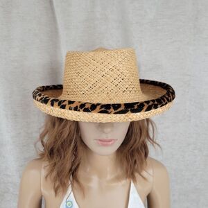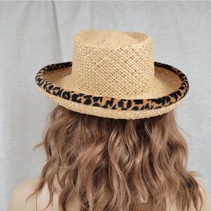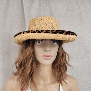 Vintage Straw Ratan Raffia Sun Hat with Velour Leopard Animal Print Edge Trim