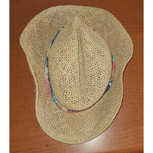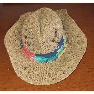 This is a vintage straw woven cowboy hat with a tropical band, perfect for golf or outdoor activities. The hat is made of straw material and has a solid pattern in brown color. It is a small size and suitable for men. The hat has a vintage style and is branded as Vintage.
