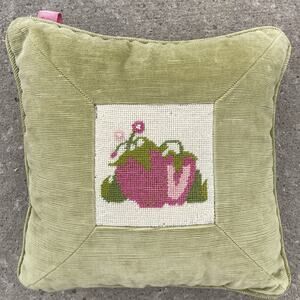 Vintage Strawberry Floral Needlepoint Pillow Velvet Back 13”x13” Cottage Grandma