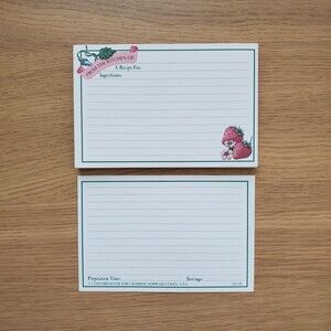 Vintage Concord House large white recipe cards with pink strawberry print and lines on front and back.