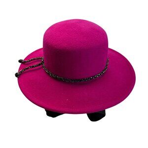 Stylish and bold, this vibrant fuchsia wool felt hat adds a distinctive touch to any outfit. The black braided cord and ties offer elegance.