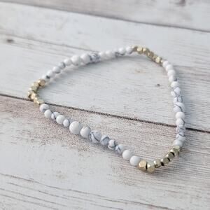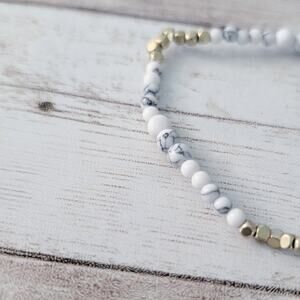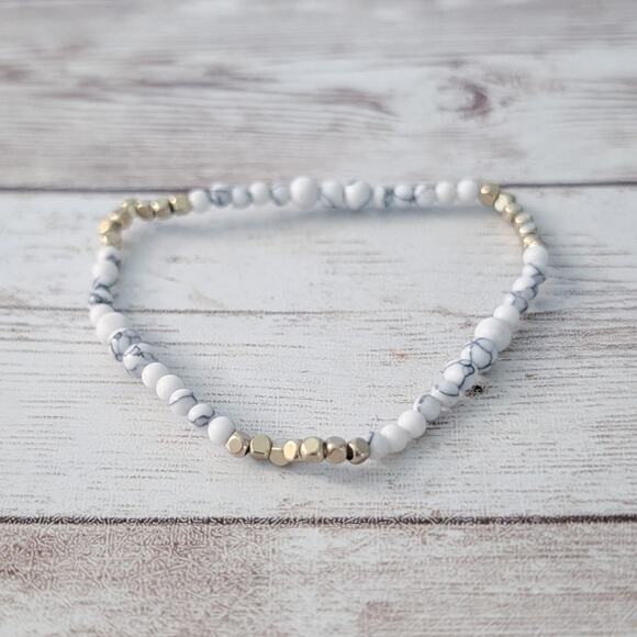 Vintage Stretch Bracelet - Thin Marbled White & Gold Tone Beads