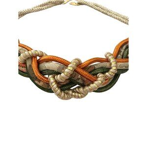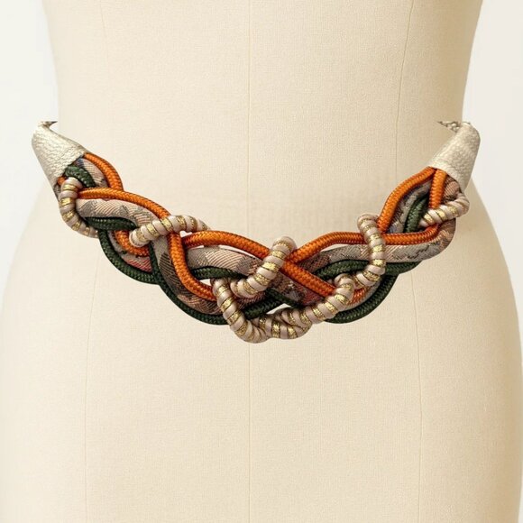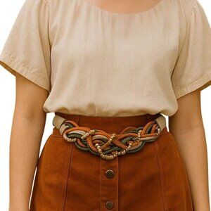 This vintage stretch braided belt features an eye-catching woven front with layered cords in warm earth tones accented by subtle metallic threads. The sculptural braided design creates a bold statement at the waist while the stretch construction allows for a flexible, comfortable fit. Finished with a gold-tone hook clasp, this piece is ideal for cinching dresses, tunics, sweaters, or layering over outerwear for a true vintage boho look.