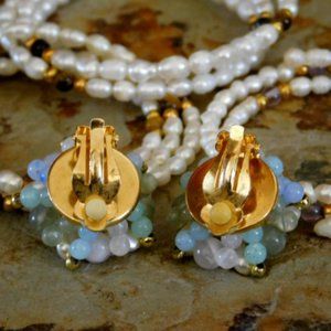 Beautiful set of 3 vintage stretch wraparound pearl bracelets with a pair of coordinating clip on earrings. Wear one or all three! The earrings are a lovely pair of clip ons (see picture of backs), approximately 1" in diameter, accented with pearls and blue tone stones. Great accessory or gift.