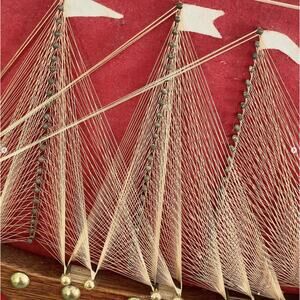 Vintage String Art Ship Boat Wood Body Brass Tacks Gold Thread Red Felt MCM