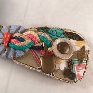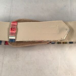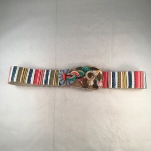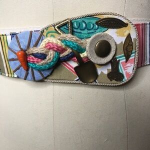 Perfect for anyone who loves to garden! Stripes are so much fun! Cute braided rope detailing. Beaded carrot. Corn, peas, radishes, and shovel are all made of metal. I have no idea what the brand of this belt is. It gives off 1980’s Lilly Pulitzer vibes though. Velcro closure on backing. Fabric outside with faux leather on backing. Slight discoloring on back. Perfect for any vintage accessories collector.
