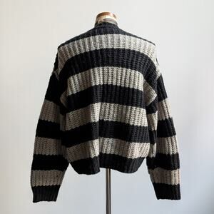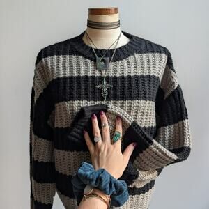 Obsessed with the slouchy oversize chunky knit sweater weather aesthetic. 90s dark cottage grunge girl does nerdcore indie skater babe vibes. Minimalist black and charcoal grey stripes. Crewneck, ribbed details, some stretch. Small intentional holes on back of sleeves - like you can lace it up? Imagine black satin lace up bows, super cute! Light to mid weight, perfect for layers. Gently used, in excellent condition.