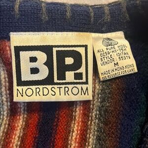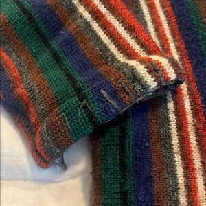 Vintage 1980s wool sweater from Nordstrom. Vibrant striped cardigan with button closure. Features a mix of earth tone colors for a bold look. Good condition, all buttons are firm and intact, there are a couple of tiny holes in the sleeve, and some of the whipstitching is loose. But considering that I have worn this sweater for 40 years, it’s in darn good shape 😂