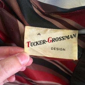 Vintage Tucker Grossman dress in a striped and stretchy fabric. Hits below the knee, boatneck neckline, and pleats at the waist. Back zipper closure and has a belt with bow design. Some wear and tear. A few tiny holes (from washing? occurred before I bought it) but are not very noticeable due to pleats and pattern on the fabric.