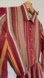 Vintage 1970s vertical striped midi dress in muted autumn hues of cranberry/brown burgundy, taupe, hunter green, marigold and white.