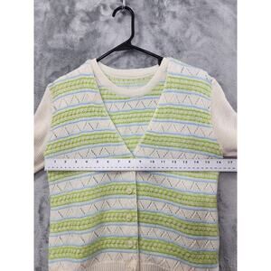 Vintage Striped Sleeveless Cardigan Twin Set Size S Cream Green Blue Pointelle Knit Thick Warm 50s 60s Grandma Grandmacore Granny Cottagecore Academia Preppy