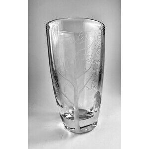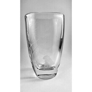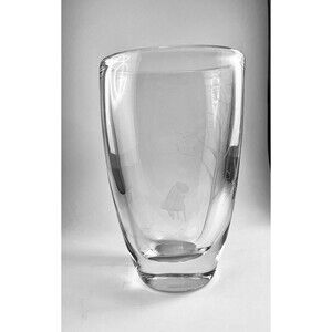 This vintage crystal etched vase from Strombergshyttan is a stunning piece of art glass. Handmade in Sweden, the vase features a couple holding an umbrella and a beautiful tree, with intricate etchings on the crystal glass. The vase stands at 8 inches tall and has a glossy finish.