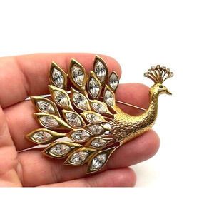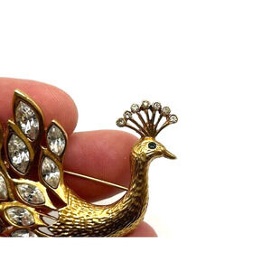 Vintage Strutting Goldtone Peacock With Navette Rhinestone Plumage Brooch Pin
