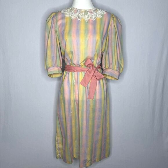 Vintage Stuart Alan pastel rainbow striped midi dress with pink belt and lace Peter Pan collar.