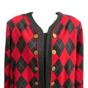Vintage Stuart Alan USA Cardigan Diamond Plaid Argyle Red Gray. Double Breasted. Antique Gold Novelty Crest Buttons. Princess Seams Front & Back. Shoulder Pads May Be Removed. Printed Size 16. Apprx. XL. but Vtg sizing - check measurements.
