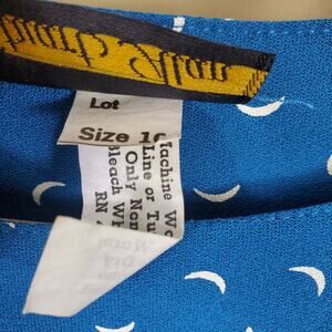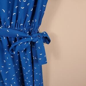 Gently used. Vintage size 10, please see measurement to ensure fit. Slightly puffed short sleeve dress. Buttons at the neck. Fit and flare with elastic waist for comfort. Tie at waist. Mini moon print.