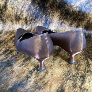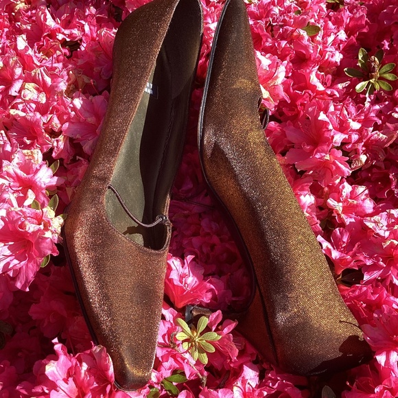 These are next level class. Vintage Stuart Weitzman brown metallic design heels. Not super high and just the right amount of elegance and class. Delicate little strap design over the top of the foot. Gold foot bed lining. Made in Italy. These heels have a metallic shimmer and reflective look. Super pretty. Good used condition.