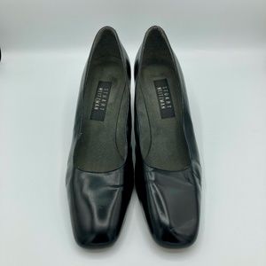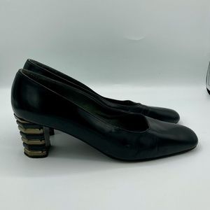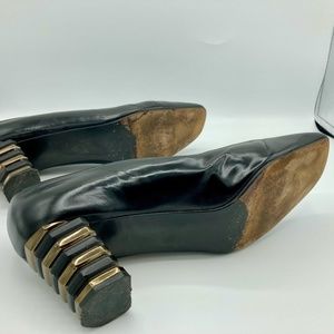 Super fun square toe, black leather, two tone acrylic block heel vintage pumps! Leather sole, leather lined. 2 & 1/2 inch heel. Size 9 & 1/2. Great pre-owned condition. Some very minor marks on leather and heels (see photos). Normal wear on soles for age of shoes. Smoke free home.