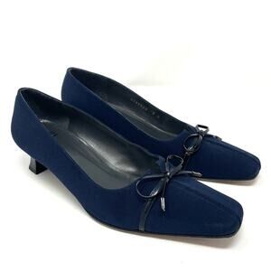 Vintage Stuart Weitzman Navy Blue Square Toe Kitten Heels w Black Bows Women's 7