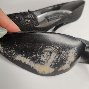 there is one minor flaw, which is totally fixable. At one time, these pumps must have had some kind of rhinestones (4 on each toe) but all but one are missing. This is an easy fix and an opportunity to add your own style to these shoes. You can find packages of rhinestones of all colors at any hobby store for as little as 3-4 bucks.