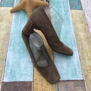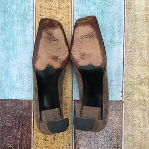 VTG Stuart Weitzman chunky 2.5” heel pump with square toe. Fabric is a beautiful dark tan / beige and black suede houndstooth design. Shades change when rubbed. Leather sole. Made in Spain. Vintage with subtle wear. Absolutely beautiful!