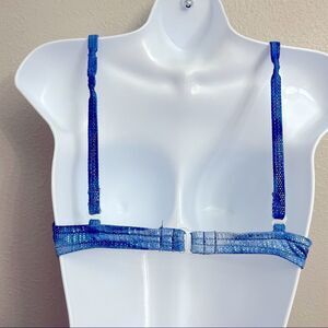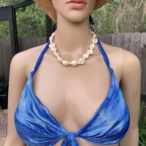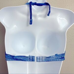 90s vintage tie front can be worn as halter bikini (top only) or with bra hooks (see pictures). Beautiful blue with varying colors in shimmer design.