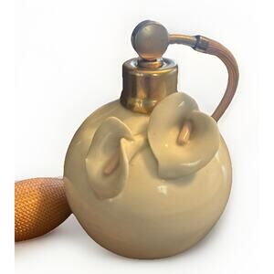 This vintage studio art pottery Calla Lily sculpture atomizer perfume bottle is an exquisite piece of decor for any vanity or perfume collection. Handcrafted with intricate details, this signed item exudes a unique style and charm. Perfect for storing and dispensing perfume, this atomizer adds a touch of elegance to any space with its artistic design inspired by nature. Collectors and admirers of unique and artistic pieces will appreciate the beauty and craftsmanship of this vintage creation.