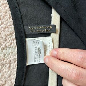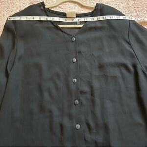 Semi sheer 5 button front blouse with flowy sleeves. Lagen look. Fabric made in Italy. Top made in Canada. Side slits. No flaws. Has shoulder pads that could be removed.