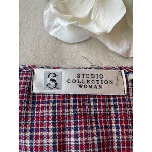 This charming vintage vest is a delightful piece from Studio Collection Woman. The intricate floral embroidery on a rich navy backdrop evokes a timeless elegance. The plaid back adds a rustic touch, making it a unique addition to any vintage wardrobe.