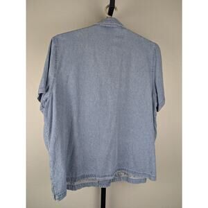 Vintage Studio Collection size 22W short sleeve denim shirt. Collared, silver metal buttons. Safari theme embroidery- zebra, giraffe, leopard/cheetah. 100% cotton light wash denim.