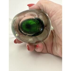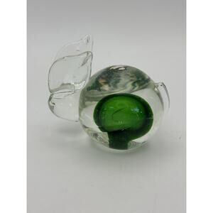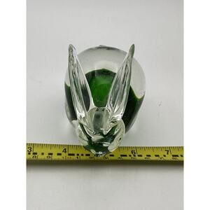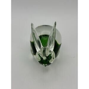 This vintage studio-crafted glass rabbit figurine is a beautiful and unique piece that adds character to any space. The clear glass with a green center gives it a stylish and eye-catching look, perfect for collectors or those who appreciate handmade art. The abstract design and glossy finish make it a contemporary piece that stands out from more traditional décor. Measuring 4 inches, this paperweight is a charming addition to any collection, with a production technique that showcases the artistry and craftsmanship of the late 20th century. It measures 3.5" tall, 4" long and 2.5" wide. It weighs 1 lb. It is in excellent condition with no chips or damage.