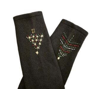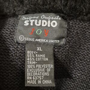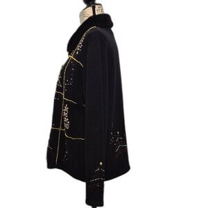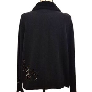 Vintage Designer’s Originals Studio Joy sweater! Made from 55% ramie and 45% cotton. This black sweater offers a soft, breathable feel with a touch of durability. Featuring festive embroidered Christmas trees and shimmering gold bead accents in a charming grid pattern, it’s a perfect statement piece for holiday gatherings. The cozy faux fur collar adds an extra touch of warmth and elegance.