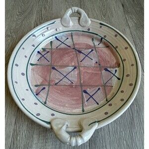 Vintage Studio Pottery 11” Plate Platter Dish Handles Abstract Signed Blue Pink