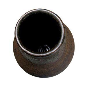 Vintage studio pottery bottle, signed “Dutton” and dated “9/62” on the base. Crafted in dark brown stoneware with a glazed interior and neck, the exterior remains unglazed, showcasing a raw, tactile surface. A white abstract motif—reminiscent of a tree limb or branching form—emerges organically from the clay, adding visual depth and folk-art charm.