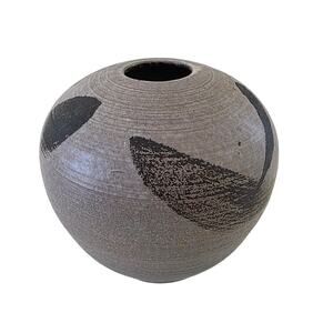 Beautiful vintage studio pottery vase with a mid-century modern feel. Handcrafted in unglazed brown clay with abstract black brushstroke motifs around the body. The organic spherical shape, natural texture, and minimalist decoration evoke an earthy and timeless aesthetic. Ideal for collectors of studio pottery or lovers of wabi-sabi decor. No maker’s mark visible—likely a one-of-a-kind artisan piece from the 1950s–70s era.