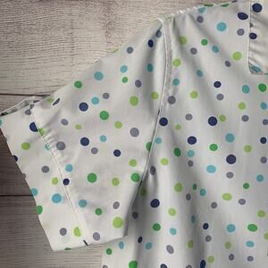 Vintage white with blue and green polka dot button down shirt by Studio Works. This collared shirt has short sleeves, a full button up front, and bottom side slits. It is pre-owned with a few very small pin-sized spots, next to buttons and on back, but is otherwise in great condition.
