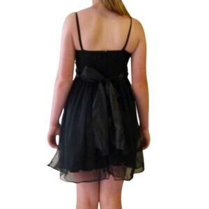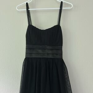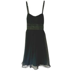 Women’s Vintage Studio Y Sleeveless Dress black, sleeveless cocktail or party dress with a empire rusched sweetheart neckline, spaghetti straps, and an A-line silhouette with a layer of tulle for volume in the skirt