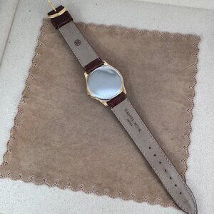 Discover the elegance of a vintage Daniel Mink designer watch, Swiss-made and strikingly slim at just 6.5mm. This exquisite timepiece features an 18-karat, 10-micron gold plating, Roman numerals, black hands, and a date function set against a guilloche enameled white dial. Its mineral crystal face is water-resistant up to 100 meters and is complemented by an original 9-inch brown embossed leather strap. The case measures 1.3 inches or 33mm in diameter with a stainless steel back. A testament to high-quality craftsmanship from the 1980s, this Daniel Mink watch boasts a flawless mineral crystal and comes with a newly installed battery, registered under 2854 61117.