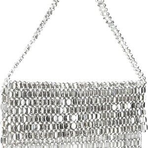 Features: Luxurious acrylic beaded clutch adorned with shimmering silver sequins, creating a high-end, eye-catching look. Compact and lightweight, designed to hold your essentials like phone, lipstick, keys, and coins. The flap closure adds a polished finish — perfect for evening wear.