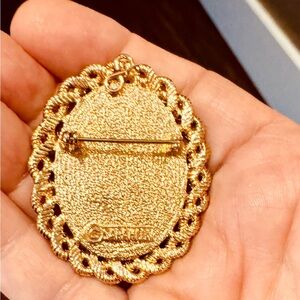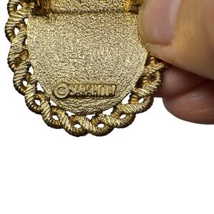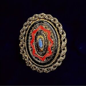 Elegant Sarah Coventry vintage brooch featuring gold and red accents with a touch of blue. This is part of a vintage brooch collection that I purchased sometime ago, and instead of having it sit in a jewelry box, I decided to list it — there are those out there who appreciate and collect Sarah Coventry, known for her Mid- to late 20th designs. The brooch appears to be in reasonably good condition with no obvious scuffs or marks. I have done my best to take pictures, including video to provide a complete description and I will refer you to those — but ask that you contact me with any other other questions. The item size is approximately 1.8 inches long, and 1.5 inches wide.