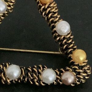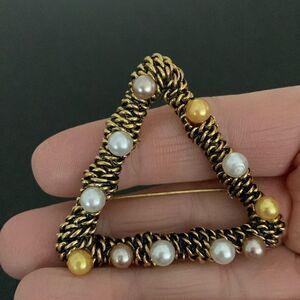TAGS: brooch antique retro style gold metallic pearls faux triangle estate lapel pin hat clutch pin boho bohemian minimalist delta faux imitation pearl metal geometric abstract preppy elegant symbol vintage artistic handmade hand crafted artisan estate family heirloom elegant dainty delicate glam pearl boho chic designer bohemian