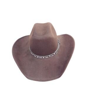 Classic brown cowboy hat in a size small with structured western silhouette and black-and-white stitched band. Soft felt construction with wide curved brim makes it ideal for festival season, rodeo nights, Burning Man, or a country-themed vacation. A great staple for Western wear lovers, costume collectors, or anyone channeling rustic, equestrian, or cottagecore vibes. Perfect for Father's Day, summer holidays, and fall events like Thanksgiving or Labor Day. Style with denim, fringe jackets, or bolo ties from our shop.