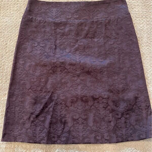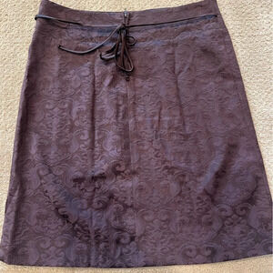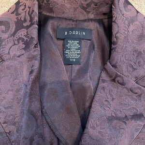 Brown floral brocade mini skirt with matching blazer. Size 7/8 Dark brown sheen fabric with a raised ~ embroidered pattern. Wears high on the waist with an above the knee length. Back zipper closure with string ties at the waist. Brand is B Darlin.