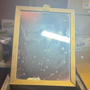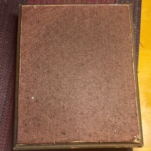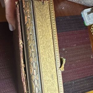 Decorative jewelry box featuring Victorian-style artwork. Elegant design with intricate details. 3 sections inside with discolored mirror. Small damage from age pictured. 10” x 8” x 2 1/2”