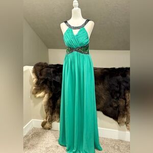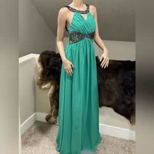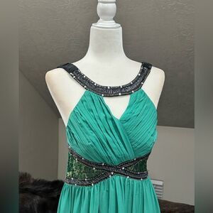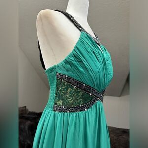 Vintage Style. Dress is in excellent condition. Colorblock design and floral lace at waist . The back is designed with elastic pleated folds and provides a comfortable fit. Delicate beading and sequins. Flowing and elegant for formal events and evenings.
