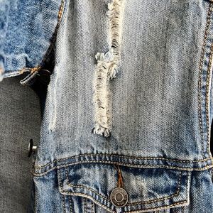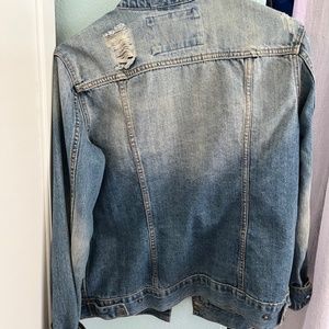 Denim Jacket from Tilly’s size small but could fit medium as well. Relaxed fit, distressed look, super comfortable.